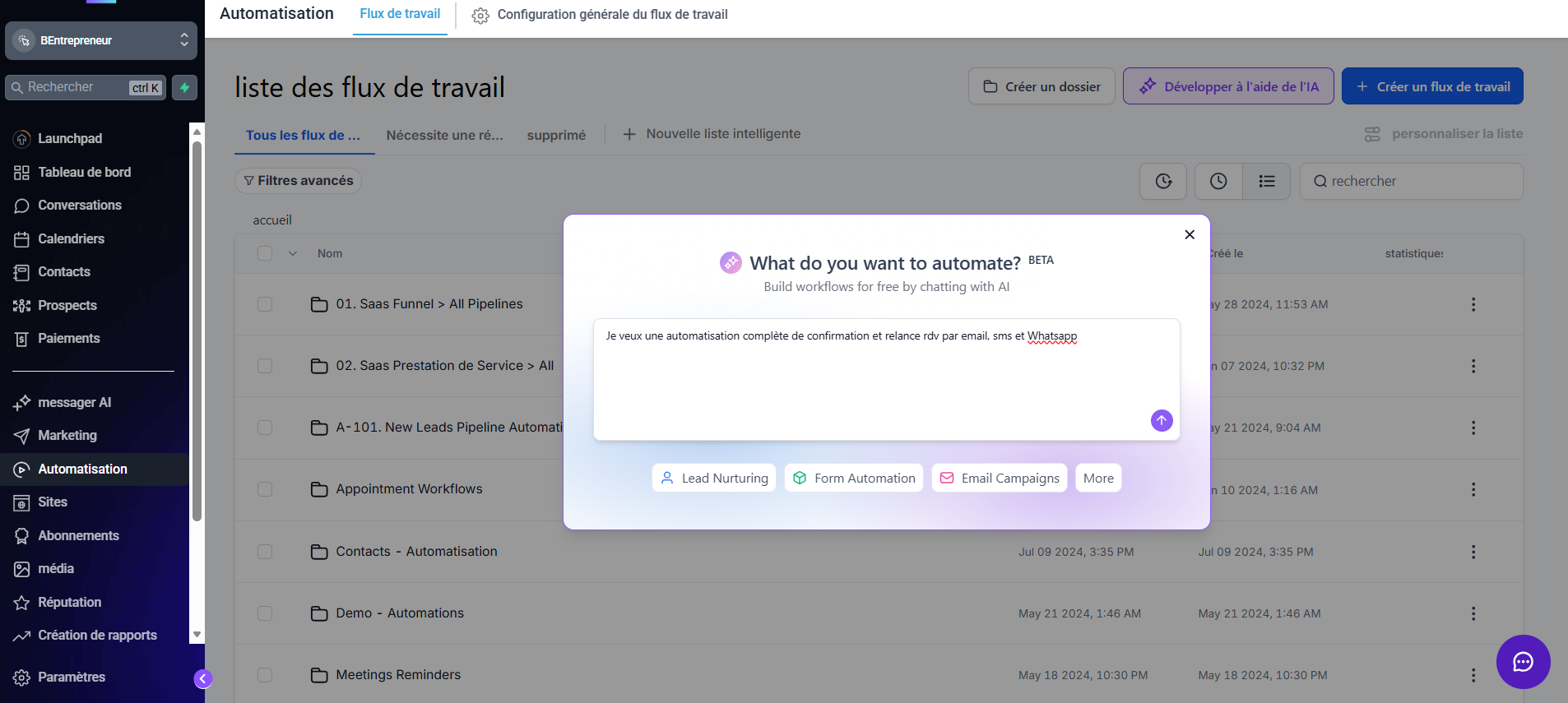 Oui, l’IA de BEntrepreneur te permet de créer une automatisation complète en une phrase.