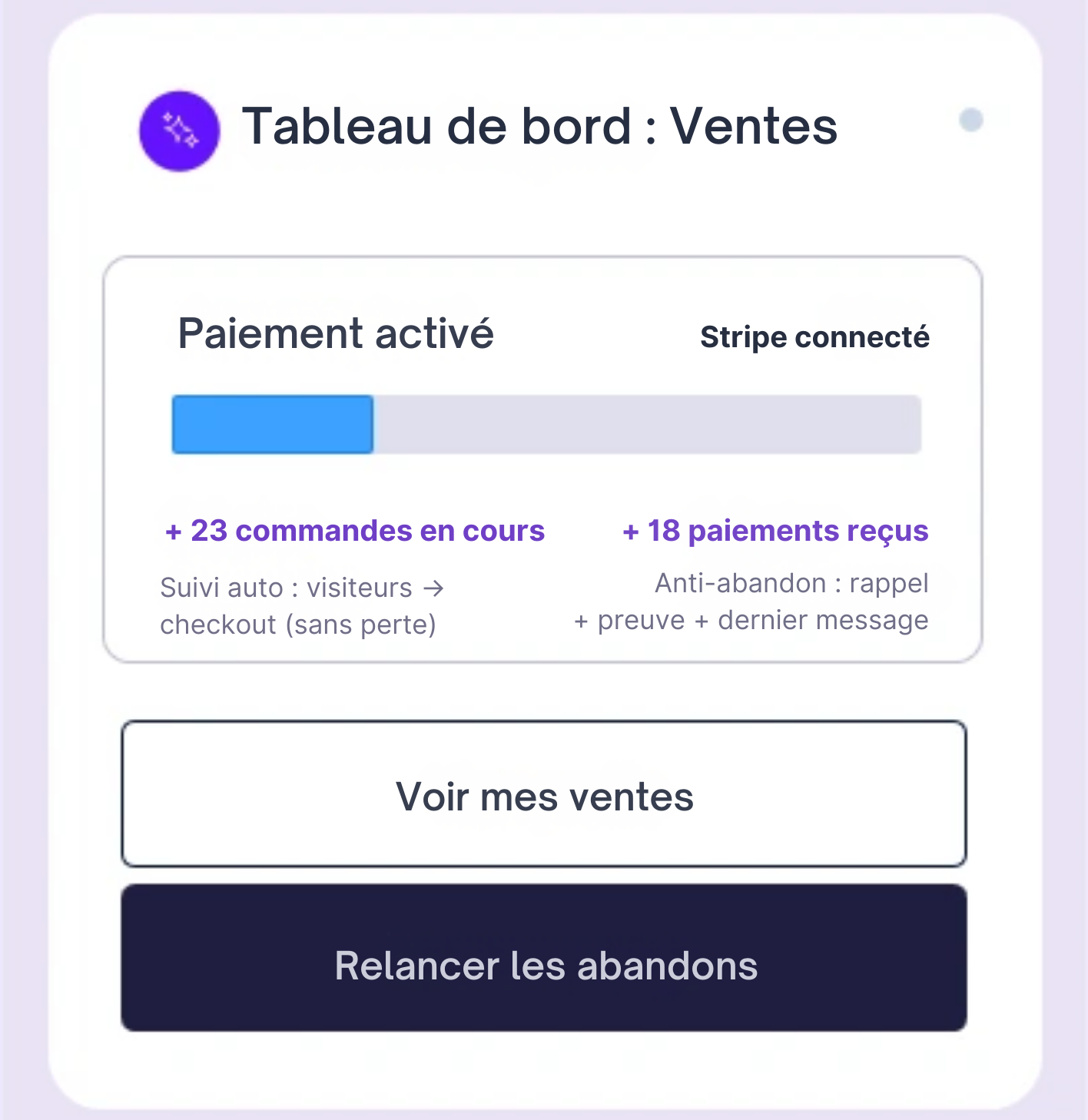 Après : checkout → relances anti-abandon → plus de paiements sans passer tes soirées à suivre.