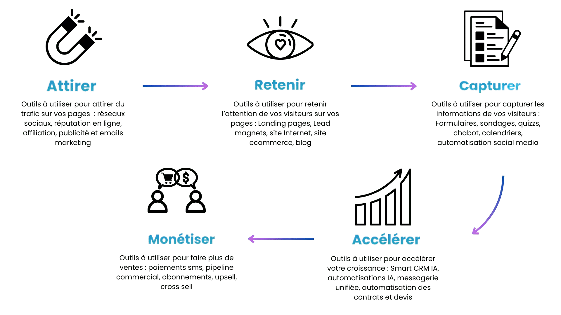 Attirer, Retenir, Capturer, Accélérer et Monétiser.